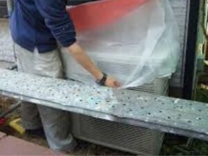 エアコンの室外機も、塗料からしっかり守りつつ、排気口や吸気口を塞がないように養生。