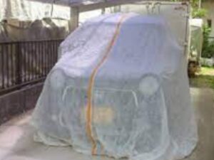 お車は不織布カバーで全体を覆い、さらに飛散防止ネットで二重の対策を。
